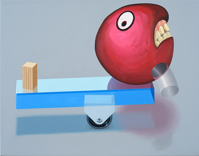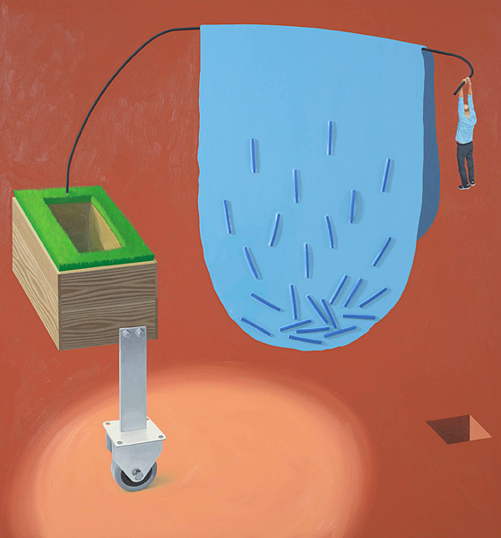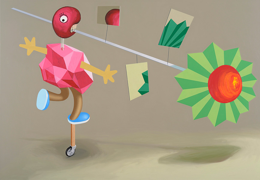 Vaikelu värdja ja geomeetriliste põhivormidega, õli ja akrüül lõuendil, 270 × 390 cm, 2012